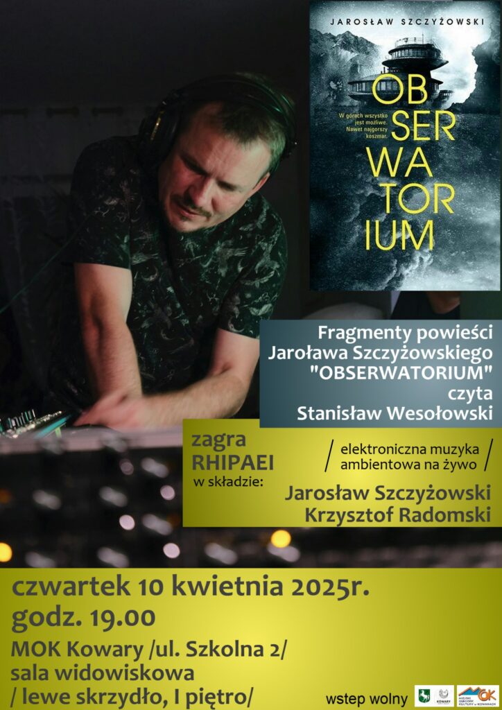 Zapraszamy 10 kwietnia o godz. 19.00 do naszej sali widowiskowej na wyjątkowe wydarzeni literacko – muzyczne. Stanisław Wesołowski będzie czytał fragmenty bestselerowej powieści „Obserwatorium” Jarosława Szczyżowskiego. Zagra RHIPAEI, czyli autor i Krzysztof Radomski. Wstęp wolny zapraszamy.