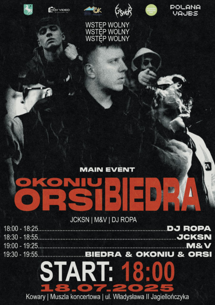 18 lipca o godz. 18.00 zapraszamy na koncert w rytmie hip-hopu. Wystąpią Biedra i Goście. Muszla koncertowa w Kowarach.