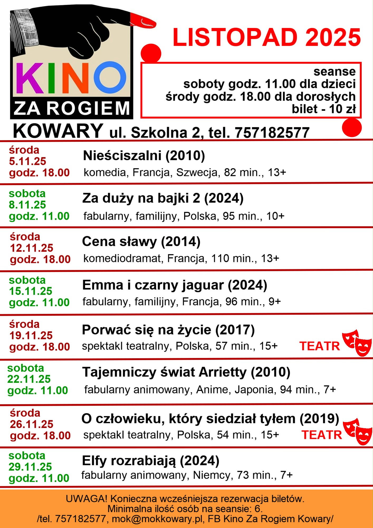Kino za Rogiem Kowary – listopad 2025 📅 Seanse: Repertuar Środa, 5 listopada, godz. 18:00 🎬 Nieściszalni (2010) Komediodramat, Francja/Szwecja, 82 min., 13+ Sobota, 8 listopada, [...] 31 października 2025